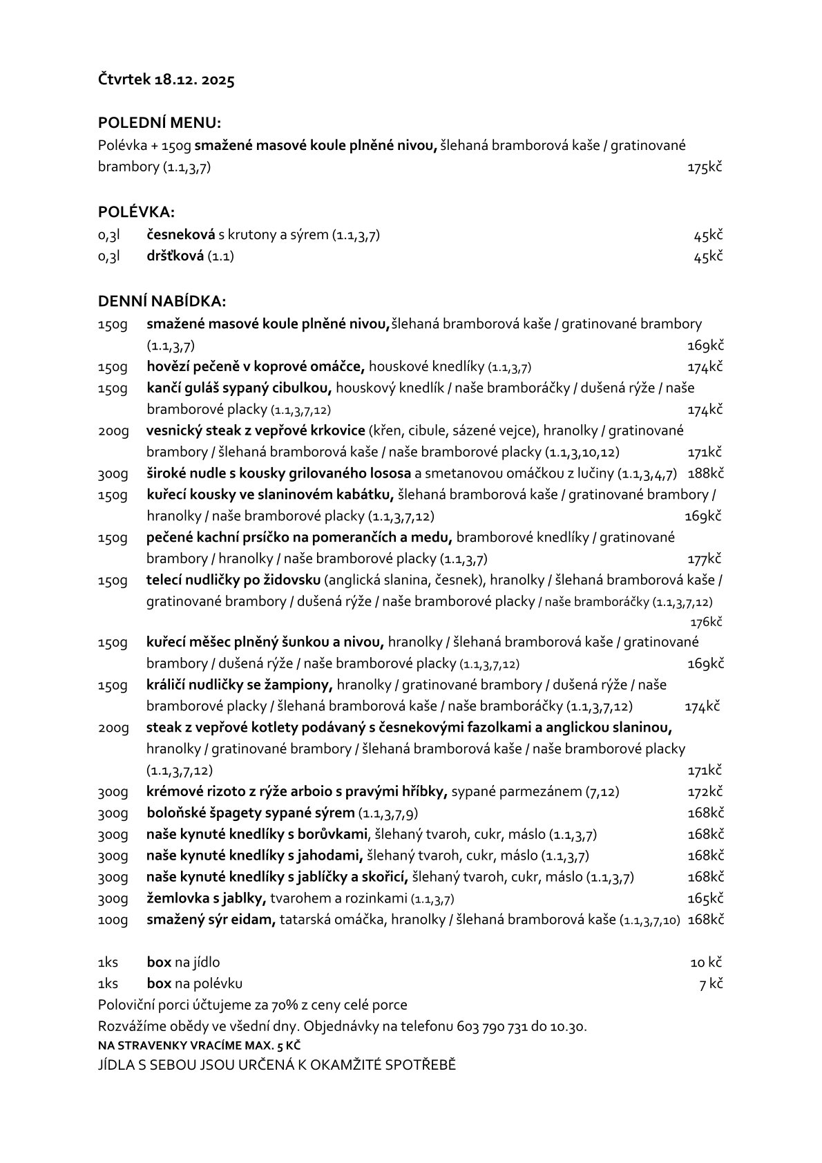 Každý den pro vás připravujeme poctivé české obědy z těch nejlepších surovin. Žádné polotovary, žádné kompromisy – jen opravdová domácí kuchyně, která vás zahřeje na duši i na těle.